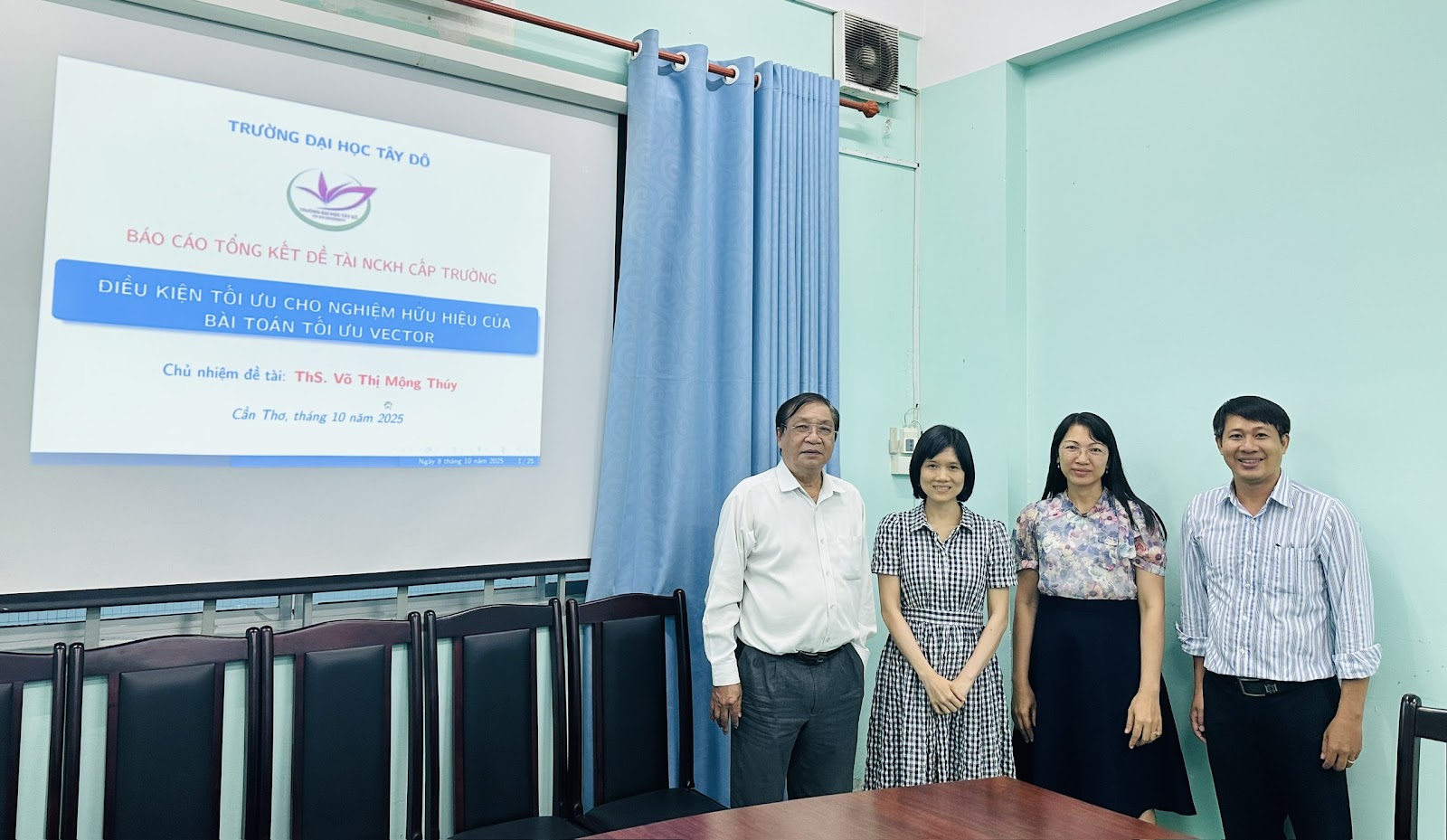 Vào ngày 8/10/2025, Trường Đại học Tây Đô đã tổ chức buổi báo cáo tổng kết đề tài KH&CN cấp trường “Điều kiện tối ưu cho nghiệm hữu hiệu của bài toán tối ưu vector” doThS. Võ Thị Mộng Thúy thuộc Khoa Cơ bản làm chủ nhiệm. Đề tài đã được triển khai trong thời gian 12 tháng và đạt nhiều kết quả có giá trị khoa học.
